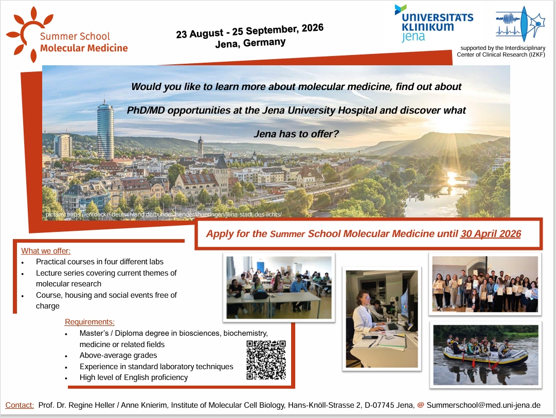 Во периодот од 23.08 до 25.09.2026 година ќе се одржи летна школа за молекуларна медицина, организирана од Универзитетската клиника во Јена. Оваа летна школа нуди можност за запознавање со актуелни истражувачки теми во областа на молекуларната медицина, како и практично искуство со современи лабораториски техники. Крајниот рок за аплицирање е 30.04.2026.