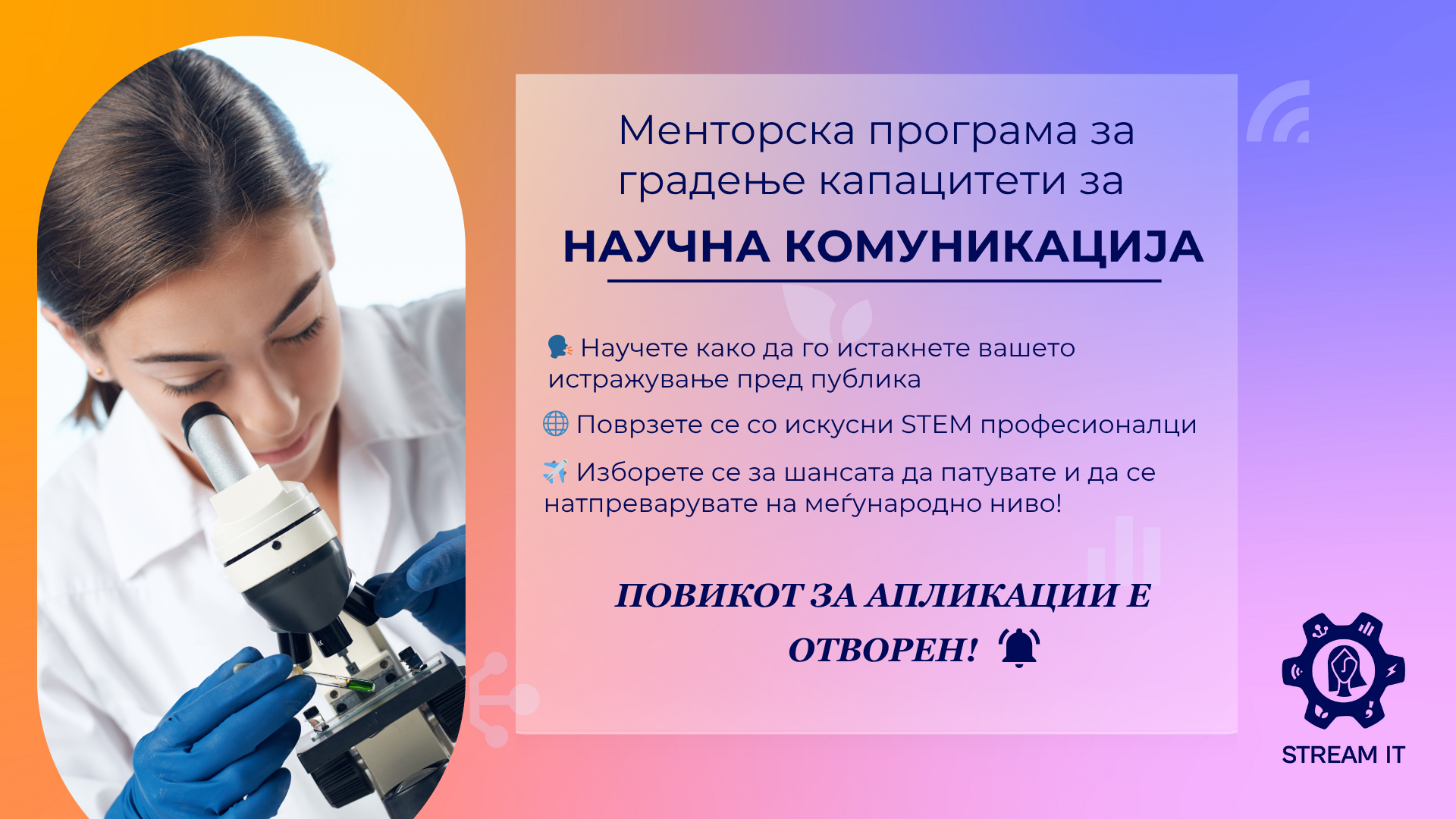 Фондацијата за менаџмент и индустриско истражување ве известува дека денес е последниот ден за аплицирање за менторската програма за градење капацитети за научна комуникација, реализирана во рамки на европскиот проект STREAM-IT.